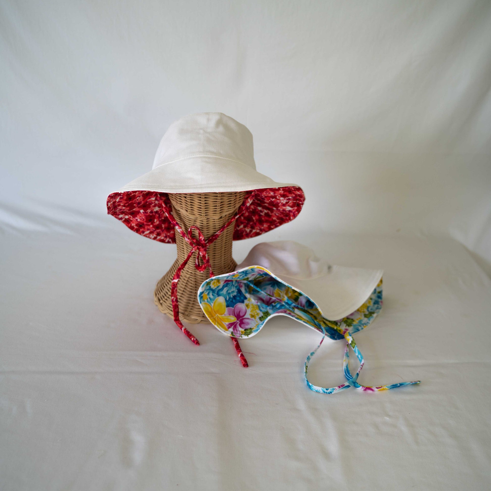 Everyone one of our Sun Hats are lovingly made using headline grabbing fabric on the inside and light coloured fabric on the exterior to reflect the sun. You can be both stylish and safe in the sun with these unique hats with a tie for safety.